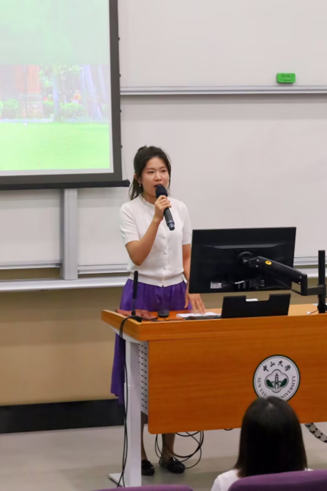 杨伊琳老师,广东省青少年体育联合会副会长、广东省人民对外友好协会理事,更是一位国际级体操运动健将、裁判。她一登台,便用其独特的体操魅力,亲自指导现场同学完成了一系列灵活的体操动作,让同学们体验到了体操训练的智慧,拉近了师生距离。