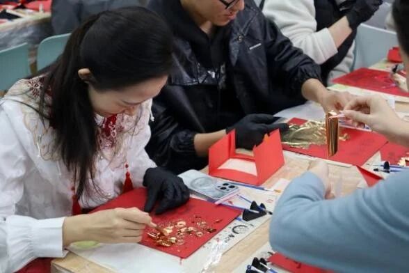 1月23日上午,靠谱的网络赌博平台 教职工之家举办了一场别开生面的“迎新春——非遗手作金箔画体验活动”。传统金箔技艺与新春的喜庆氛围完美融合,为师生们带来了一场充满创意与温情的文化体验。网赌平台 领导、老师与留校学生欢聚一堂,以薄如蝉翼的金箔为笔墨,精心制作出一幅幅寓意吉祥的马年主题金箔画作品。