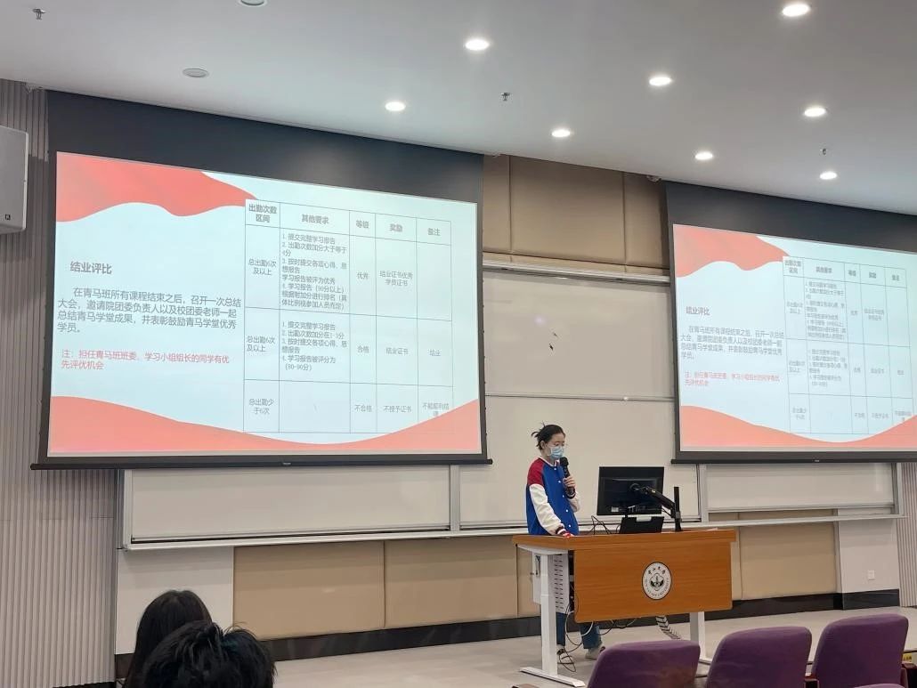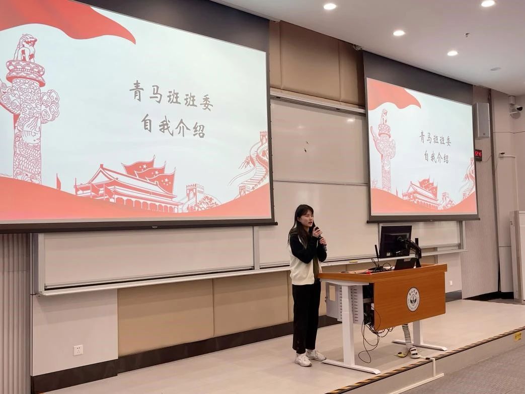 团委组织部黄桢同学详细介绍了青马学堂的课程设置及考核办法,并鼓励同学们积极参加课程学习和实践活动,不断提升自己的思想政治素养和综合能力。随后,青马班的班委及小组长进行了自我介绍发言,让同学们了解彼此,促进团队凝聚力。