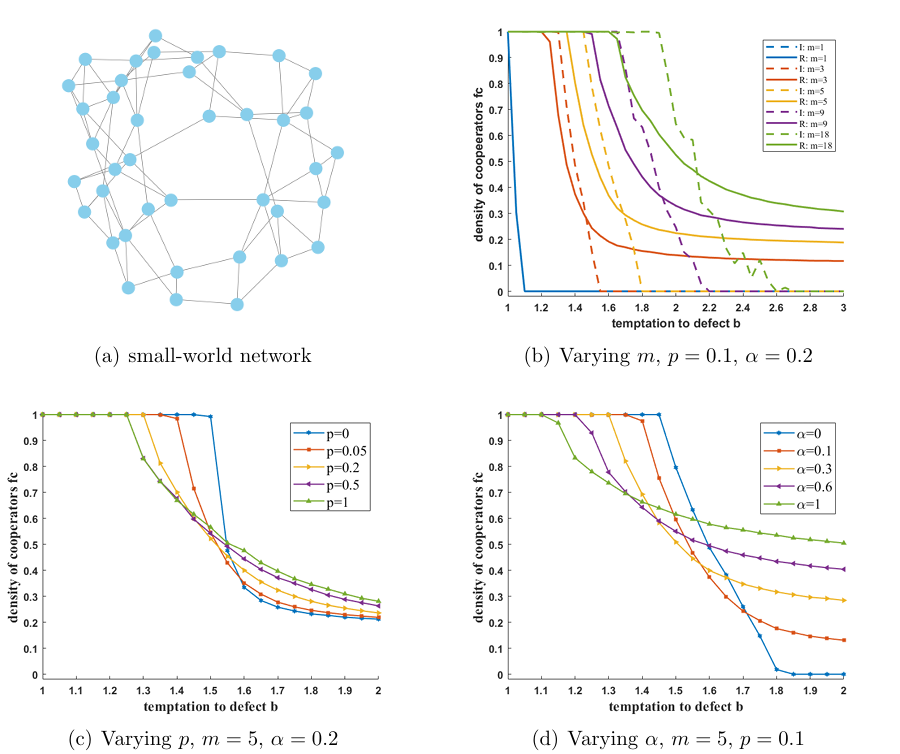 研究进一步发现,记忆长度的增加会使临界诱惑值右移,拓展后悔抑制合作的范围,同时促进策略的稳定共存。此外,过高的后悔敏感度会使合作者与背叛者比例趋近于1:1,呈现出一种动态平衡的“妥协效应”。该机制在小世界网络中也得到验证,显示出良好的模型鲁棒性与结构泛化能力。